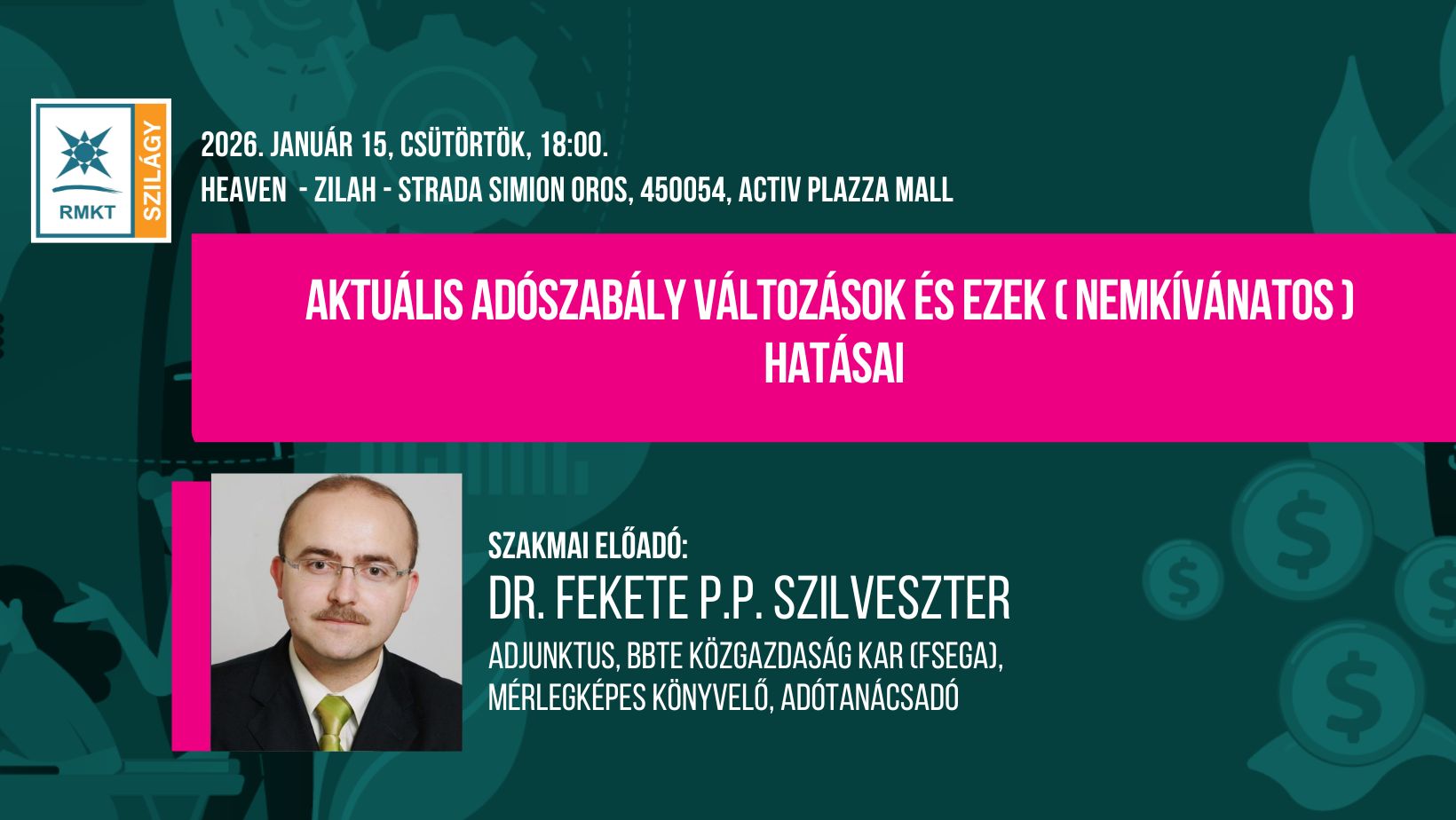 Előadó: Dr. Fekete P.P. Szilveszter – adjunktus, BBTE Közgazdaság Kar (FSEGA), mérlegképes könyvelő, adótanácsadó